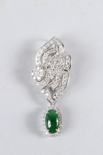 AN 18CT GOLD, JADE AND DIAMOND BROOCH.