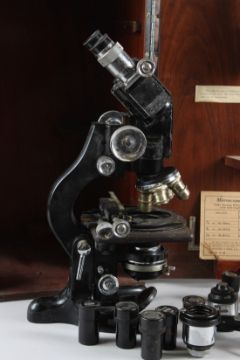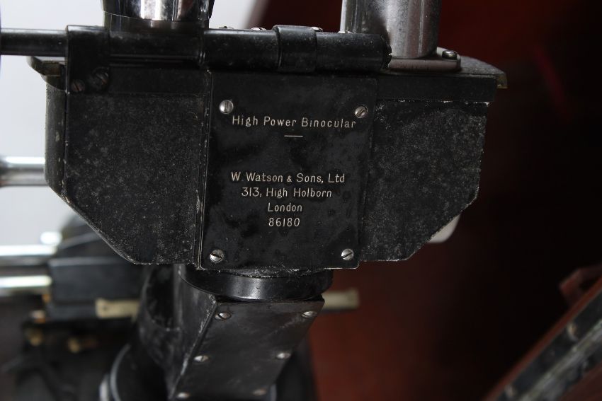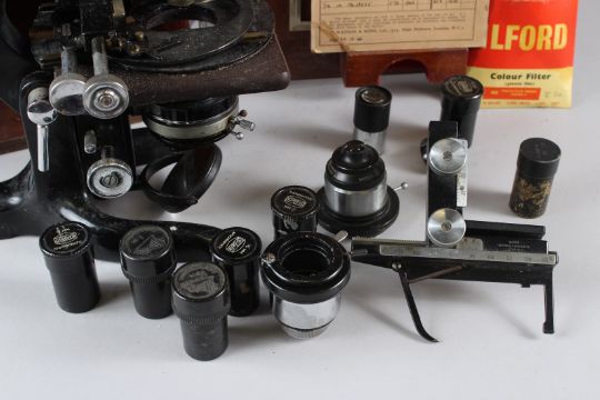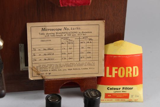 A W. WATSON & SONS LTD BINOCULAR MICROSCOPE, No. 86180, with accessories, in a mahogany case.