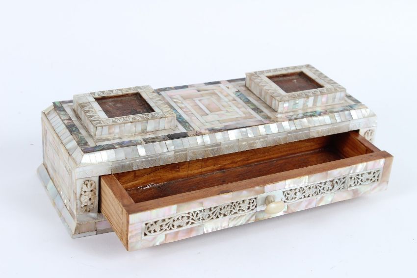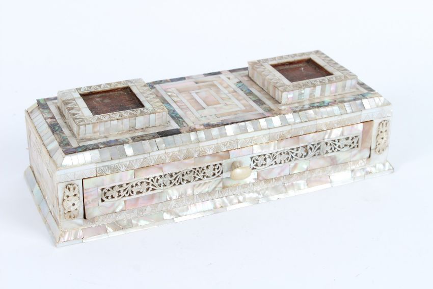 A 19TH CENTURY HOLY LAND JERUSALEM MOTHER-OF-PEARL CLAD WOODEN INKWELL STAND.