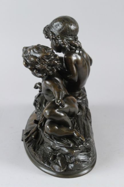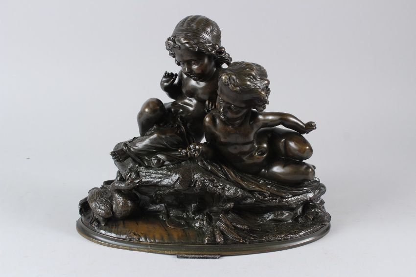 A GOOD 19TH CENTURY BRONZE GROUP, modelled as a boy and a girl seated by the water's edge, feeding a swan. 31cms wide x 26cms high.