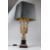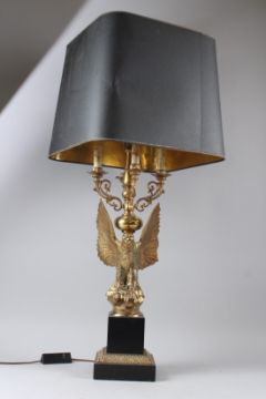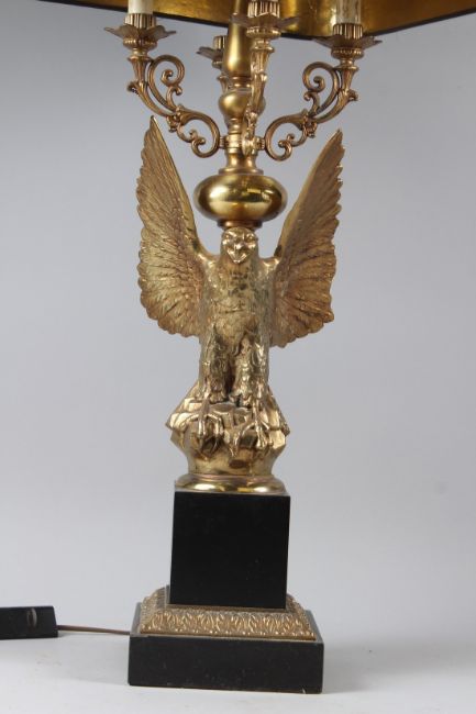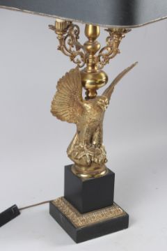 A LARGE FRENCH EMPIRE STYLE ORMOLU TABLE LAMP, modelled as an eagle seated on a rock, it's wings outswept, supporting a four branch light fitting, on a stepped square base, with shade.