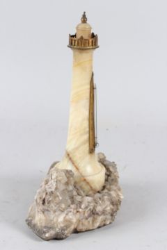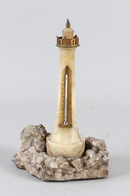 AN EDWARDIAN CARVED ALABASTER LIGHTHOUSE THERMOMETER, mounted on a realistic crystalline rockwork base.
