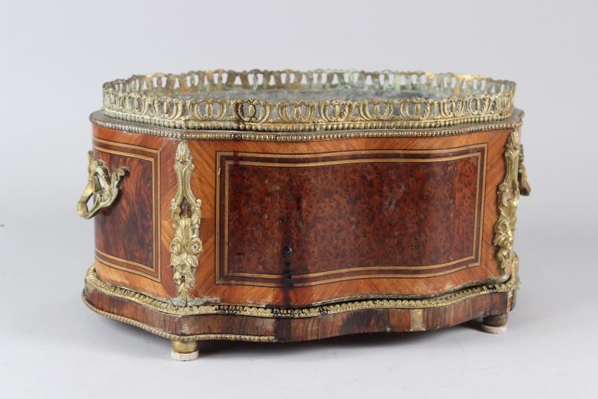 A 19TH CENTURY FRENCH ORMOLU MOUNTED KINGWOOD AND AMBOYNA TABLE TOP JARDINIERE of serpentine outline, with zinc liner.