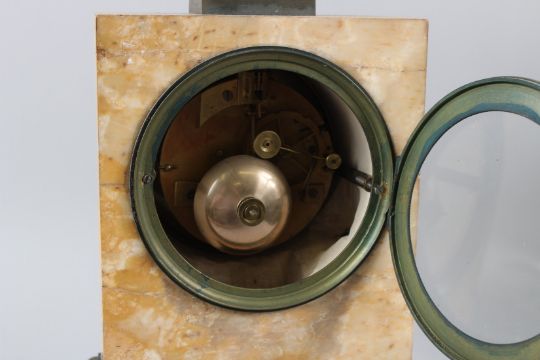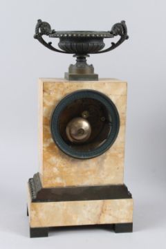 A 19TH CENTURY SIENNA MARBLE AND BRONZE MANTLE CLOCK, with urn shaped finial, the dial signed Deniere De Bronze A Paris.
