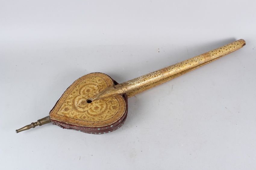 A FINE LARGE 19TH CENTURY INDIAN KASHMIRI LACQUERED BELLOWS.