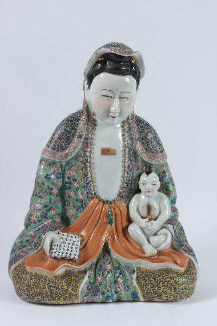 A CHINESE PORCELAIN STATUE OF GUANYIN holding a baby and a calligraphy tablet, with famille rose robe.