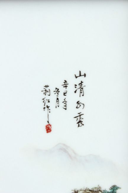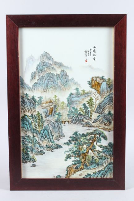 AN EARLY 20TH CENTURY CHINESE PORCELAIN FAMILLE VERTE PORCELAIN PANEL, framed, painted with a mountainous river landscape (repaired).