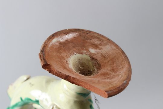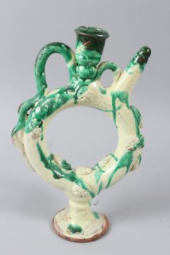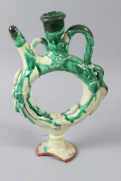 A TURKISH CANAKKALE POTTERY OLIVE OIL FLASK, with green slip decoration.