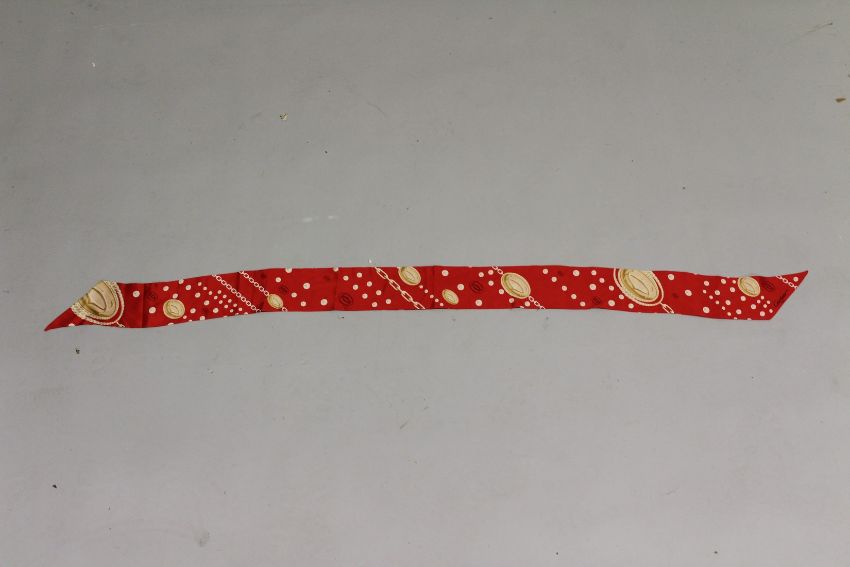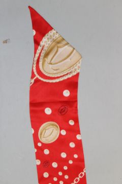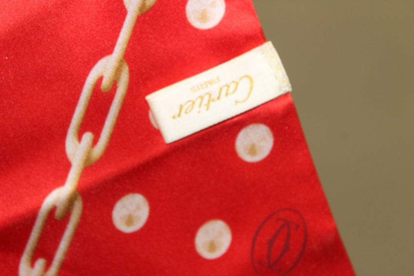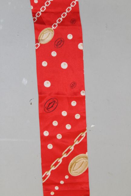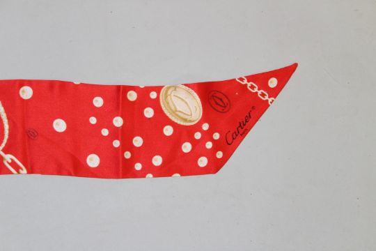 CARTIER, PARIS, A RED SILK CRAVAT, decorated with Cartier logo and dots, with Cartier bag.