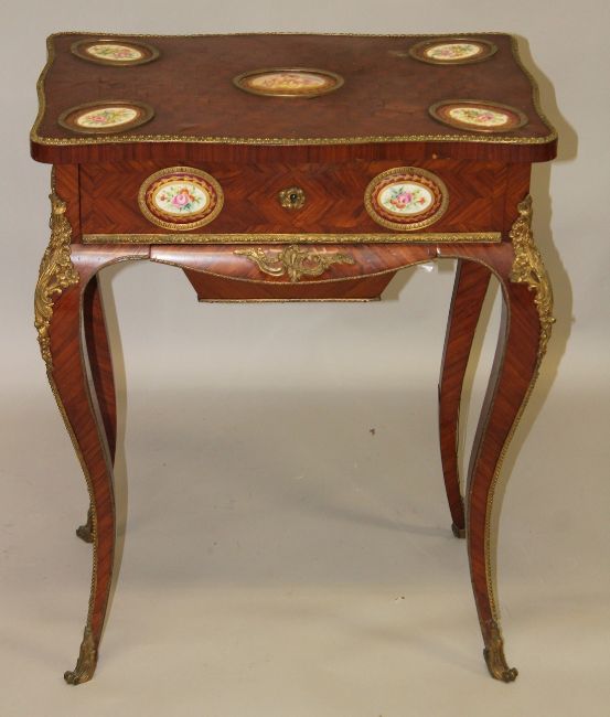A 19TH CENTURY FRENCH KINGWOOD WORK TABLE, with oval porcelain panel and ormolu mounts, the rising top with interior mirror, above a single drawer and sewing box, on cabriole legs.