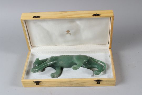 A FABERGE STYLE CARVED JADE MODEL OF A TIGER, with gold and ruby eyes, in a fitted case.