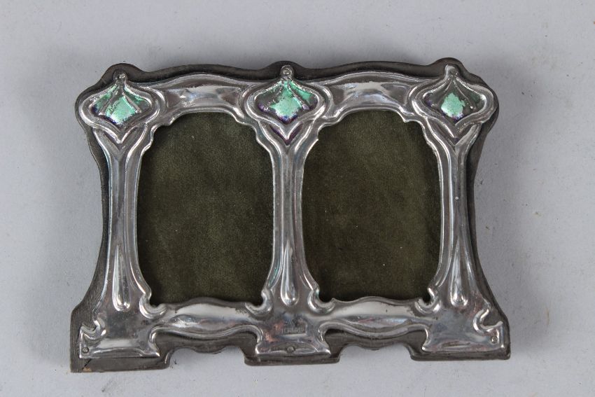 A MINIATURE SILVER AND ENAMEL DOUBLE PHOTO FRAME.