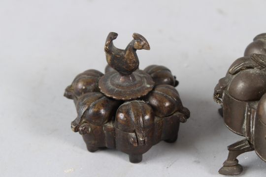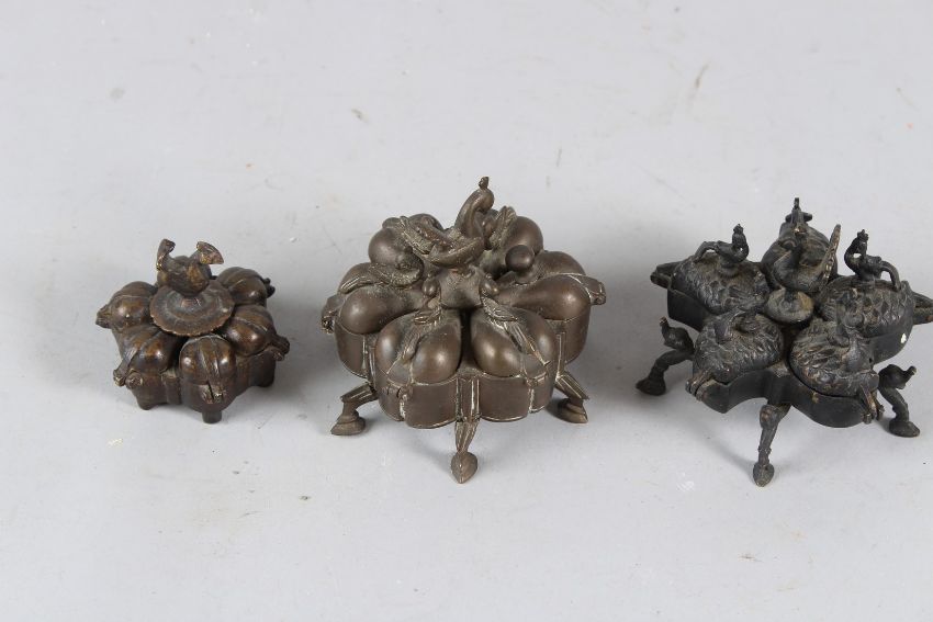 THREE 19TH CENTURY INDIAN BRASS SPICE BOXES.