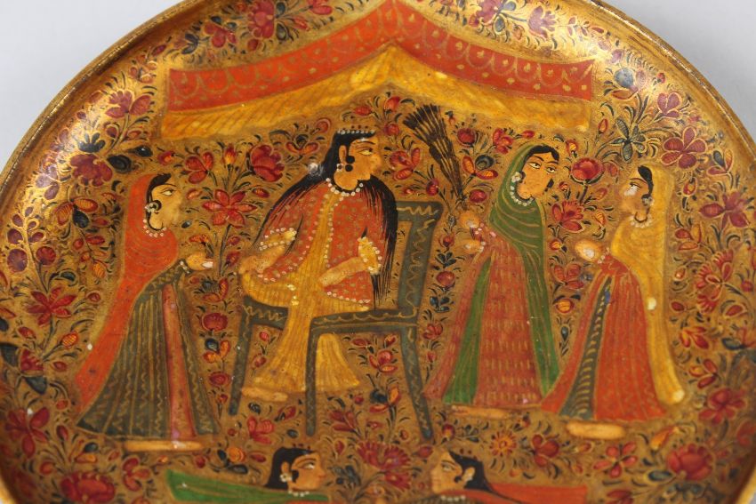 A FINE 19TH CENTURY INDIAN KASHMIRI LACQUERED PAPIER MACHE DISH depicting figural decoration.