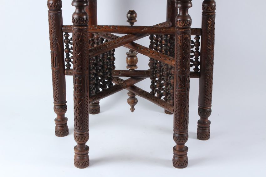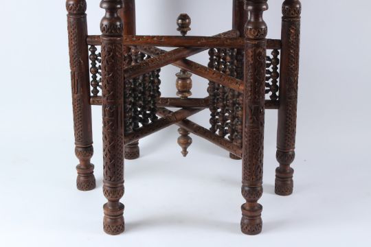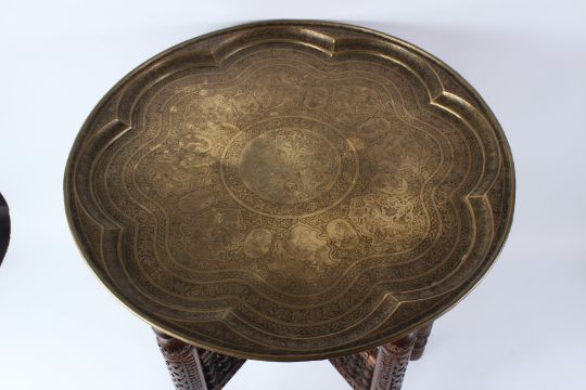AN EASTERN ENGRAVED BRASS CIRCULAR TRAY, on a carved folding wooden stand.