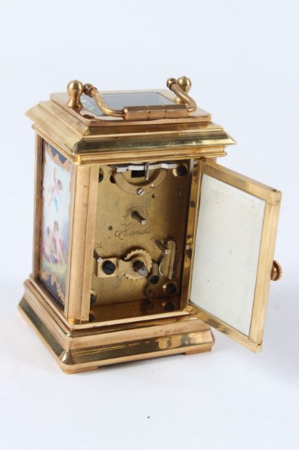 A MINIATURE BRASS MULTI-DIAL CARRIAGE CLOCK.