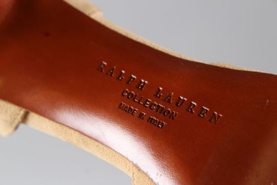 RALPH LAUREN, A PAIR OF LADIES BEIGE SUEDE LEATHER HIGH HEEL SHOES, size unknown.