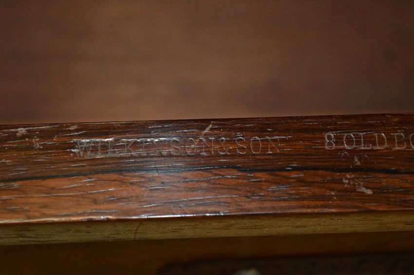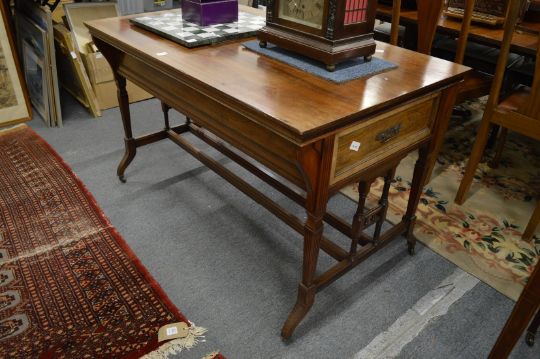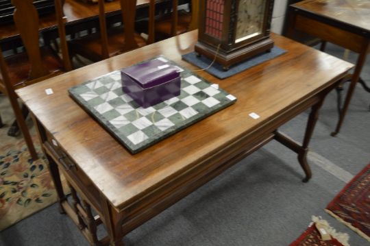 A LATE 19TH CENTURY ROSEWOOD RECTANGULAR LIBRARY TABLE, by Wilkinson & Son, 8 Old Bond Street, with a drawer to each end, four fluted square shaped column supports on curving legs united by stretchers, drawers stamped with maker's name.