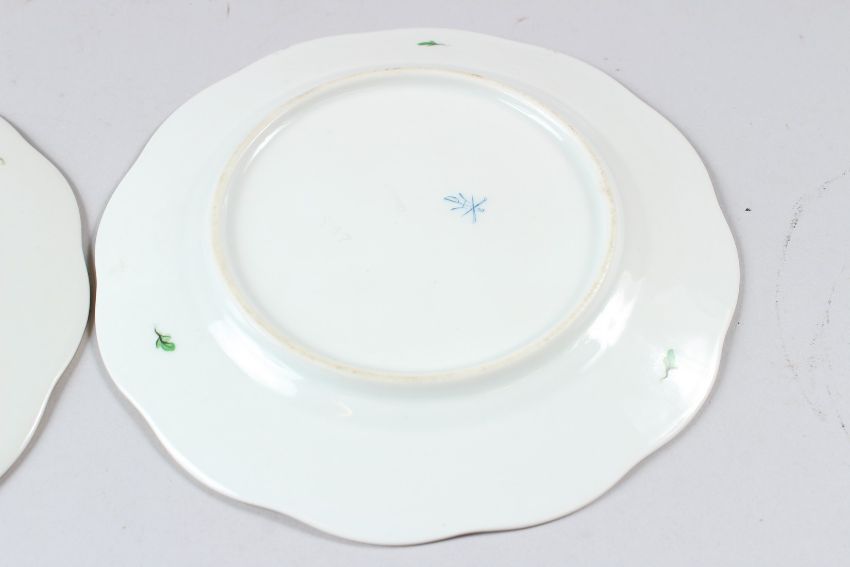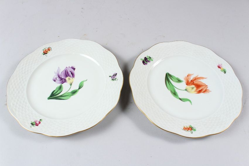 A PAIR OF HEREND PORCELAIN PLATES, with basketweave border and floral decoration.