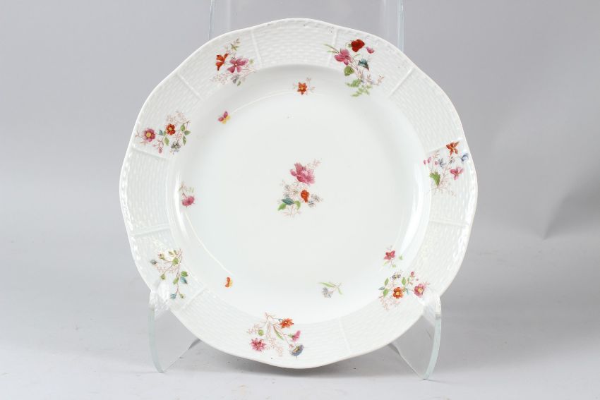 A HEREND PORCELAIN CIRCULAR DISH, with basketweave border, painted with flowers.