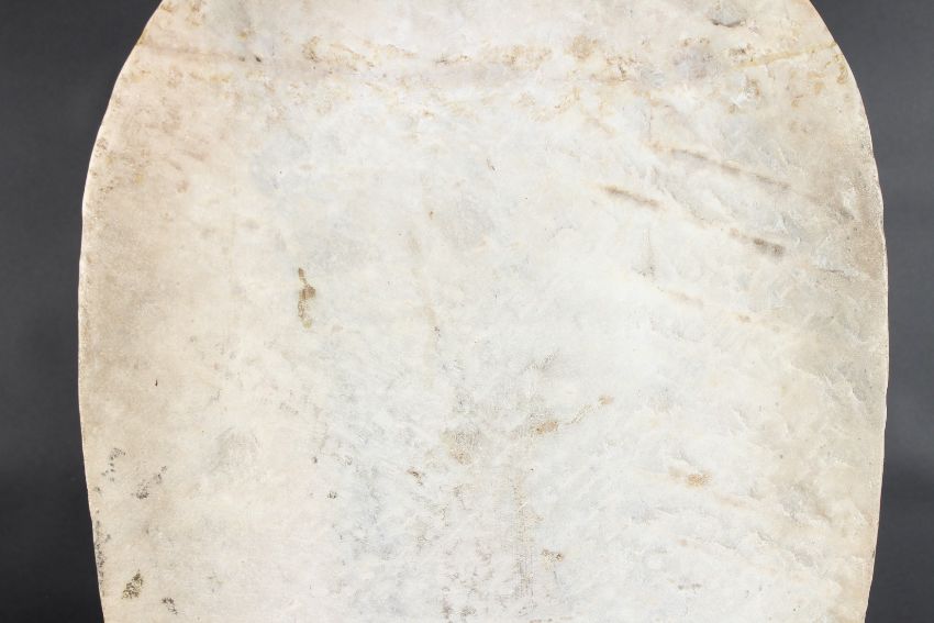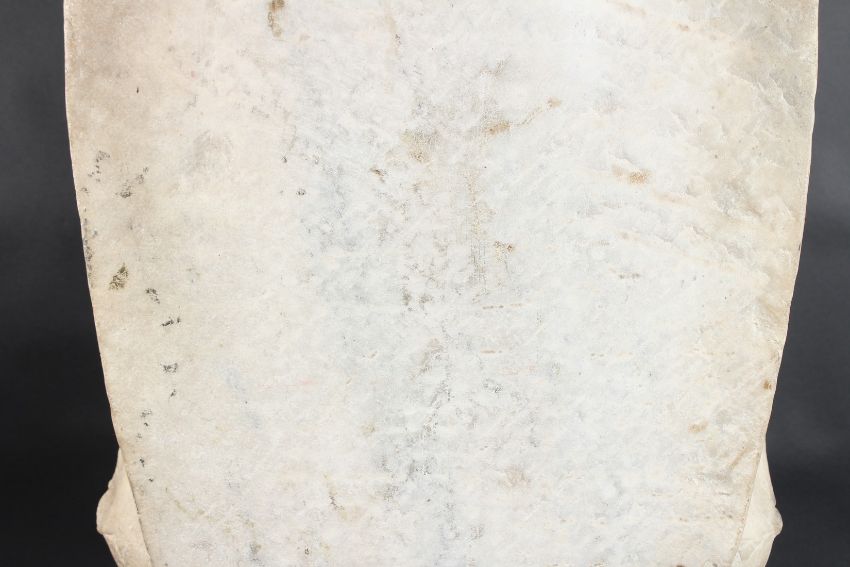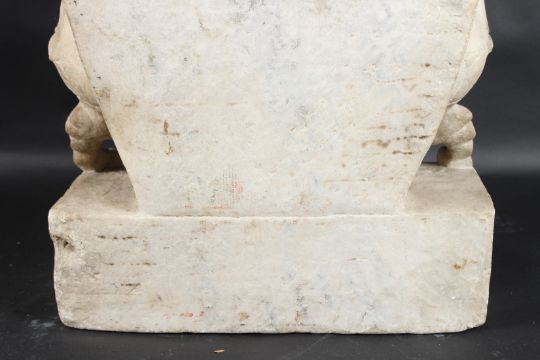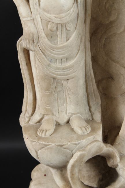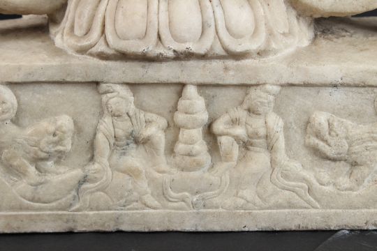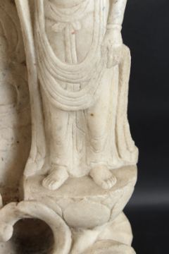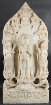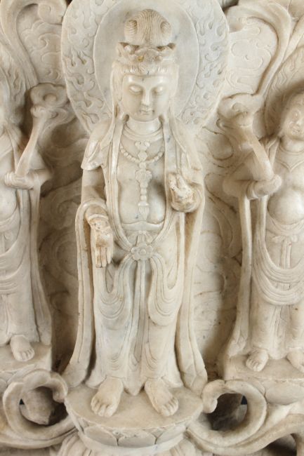 A large upright slab of marble carved with a central BUDDHA flanked by bobhisattvas.