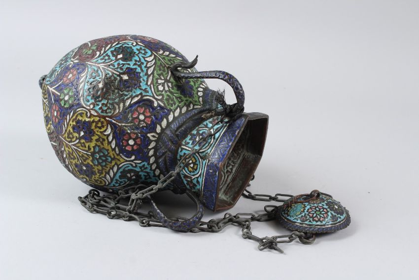 A VERY FINE AND UNUSUAL 19TH CENTURY INDIAN KASHMIRI ENAMELLED COPPER HANGING MOSQUE LAMP.