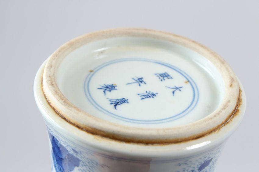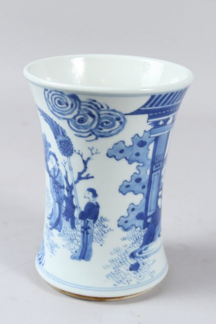 A CHINESE BLUE AND WHITE PORCELAIN BRUSH POT, of waisted form, painted with figures in a landscape.