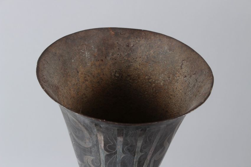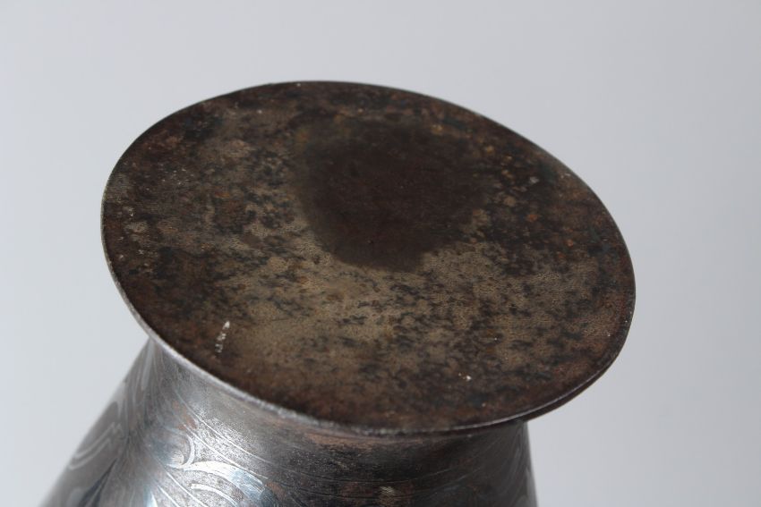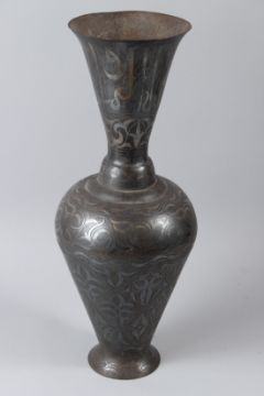 A LARGE ISLAMIC SILVER INLAID STEEL VASE.