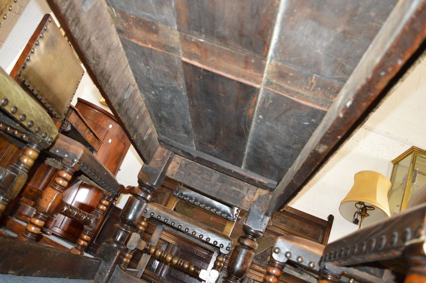 AN 18TH CENTURY OAK REFECTORY DINING OR SIDE TABLE, with a cleated plank top, partially carved frieze on four baluster turned legs, united by stretchers.