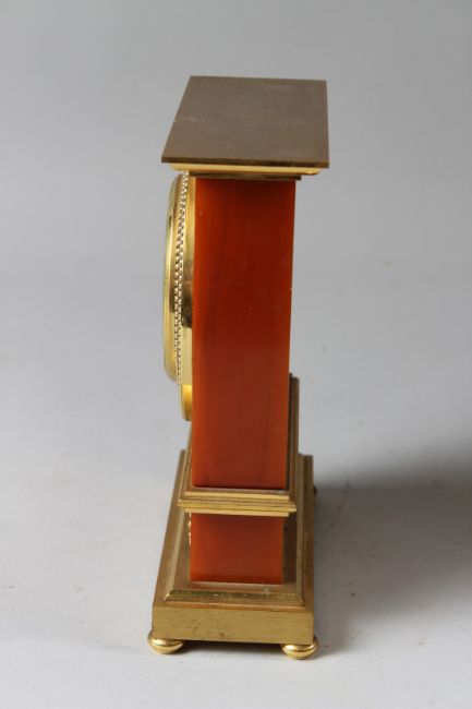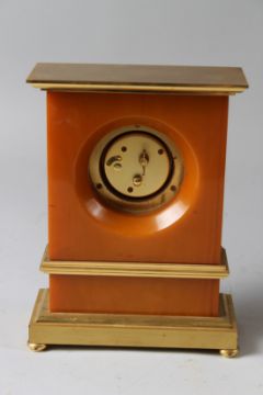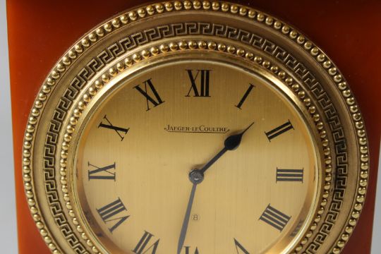 JAEGER-LECOULTRE, A GOOD DESK OR MANTLE CLOCK with amber coloured case, ormolu mounts, eight-day movement with circular dial and Roman numerals.